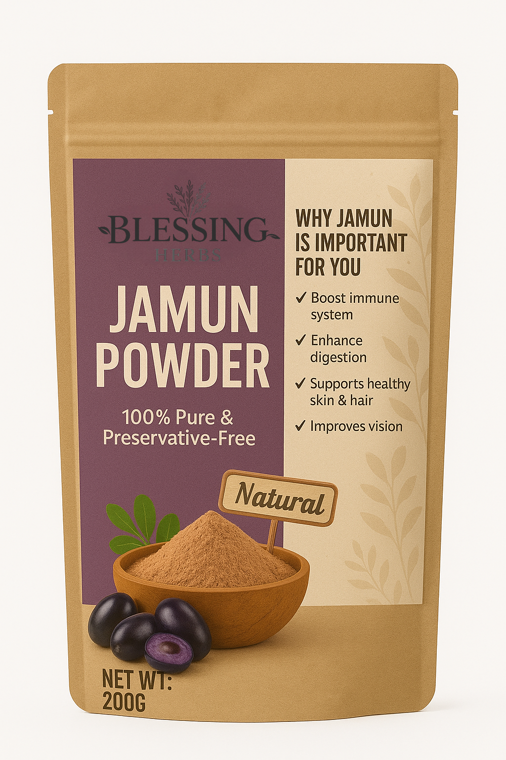 Blessing Herbs Organic Jamun Powder is made from premium-quality Jamun (Indian Blackberry) fruits, naturally sun-dried and finely powdered to retain maximum nutrients. A rich source of antioxidants, iron, vitamin C, and dietary fiber, Jamun powder has been traditionally used in Ayurveda to support healthy blood sugar levels, improve digestion, and promote liver and skin health.
